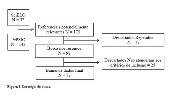 Demonstramos, a seguir na Figura 1, o esquema gráfico de como foi procedida a nossa estratégia de pesquisa para atingir a amostra bibliográfica final (N = 73).