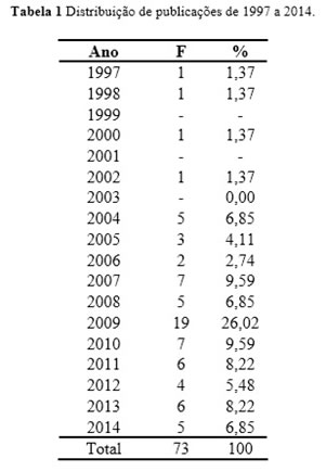 No que concerne à distribuição temporal de publicações no período analisado, 1997-2014, na Tabela 1, observamos que de 1997 a 2003 existiram poucas publicações, com alguns intervalos de produção entre um ano e outro. Entretanto, de 2004 a 2014, percebemos uma mudança em relação à constância de produções de mais de um artigo por ano.