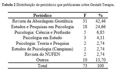 Em relação aos periódicos brasileiros que sediaram os artigos publicados nas bases analisadas, segundo a Tabela 2, destacamos a Revista da Abordagem Gestáltica – Phenomenological Studies, que exprimiu o maior número de produções (n = 31; 42,46%). Essa revista tem orientação editorial, foco e escopo voltados para publicar manuscritos fundamentados nas perspectivas humanistas, fenomenológicas e existenciais, e uma linha editorial que privilegia estudos sobre o tema da Gestalt-Terapia e Abordagem Gestáltica. Não à toa, a Revista da Abordagem Gestáltica – Phenomenological Studies congrega o maior número de publicações minutadas.