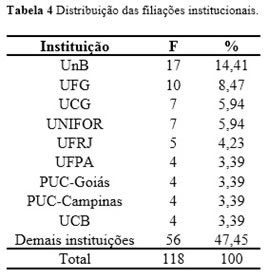 Na UnB, as pesquisas e as orientações de Jorge Ponciano Ribeiro colaboram, igualmente, com esse desenvolvimento. O destaque de Brasília e Goiás na Gestalt-Terapia brasileira foi apontado, também, pela pesquisa de Holanda (2009). Este, por um lado, evidencia uma soberania da região Sudeste, pelos Estados de São Paulo e Rio de Janeiro, nas produções de dissertações e teses sobre Gestalt-Terapia; nosso estudo, por outro viés, assinala para uma hegemonia da região Centro-Oeste, que concentra 42,74% da produção de artigos sobre Gestalt-Terapia em periódicos nacionais, sobretudo pelos Estados do Distrito Federal e Goiás. Conquanto, tenhamos tabulados diversas filiações institucionais distribuídas nas regiões brasileiras, frisamos que encontramos certa dificuldade no levantamento dessas instituições, em razão de vários autores apontarem mais de uma filiação além da universitária – geralmente um Instituto de Gestalt-Terapia. Nesse caso, por consenso, priorizamos somente o registro da filiação universitária de cada autor. Esse foi um limite do estudo.