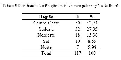 Ao redistribuir essas filiações e suas produções em termos de regiões geográficas do Brasil, obtivemos a Tabela 5, exposta em seguida: