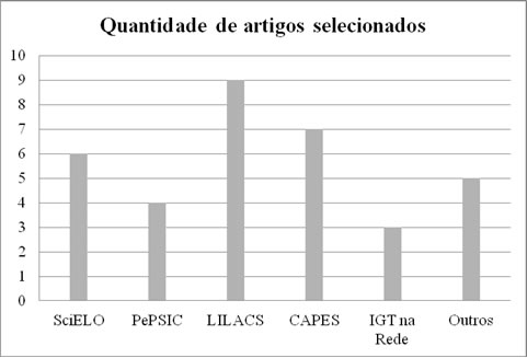 A seguir, no gráfico 1, está representada a quantidade total de artigos encontrados em cada banco de dados, a partir da interligação dos descritores citados anteriormente. Já o gráfico 2, refere-se a quantidade de publicações selecionadas enquanto eram aplicados os critérios de inclusão/exclusão. Ao todo, foram utilizadas 18 publicações eletrônicas, desconsiderando algumas repetidas ou duplicadas entre os portais, e incluindo cinco artigos de revistas científicas eletrônicas4 (representados pela categoria "outros"), dentre eles, dois internacionais.