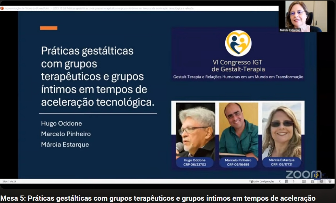 Palestra apresentada no dia 26 de outubro de 2025, pelos psicólogos Márcia Estarque e Marcelo Pinheiro e Hugo Oddone, transmitido pelo canal do youtube do IGT na rede. Sob a temática: “Práticas gestálticas com grupos terapêuticos e grupos íntimos em tempos de aceleração tecnológico e relações líquidas..”